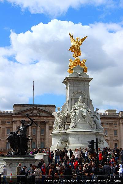金碧輝煌的維多利亞女王紀念碑 與正門上莊嚴的皇室徽章